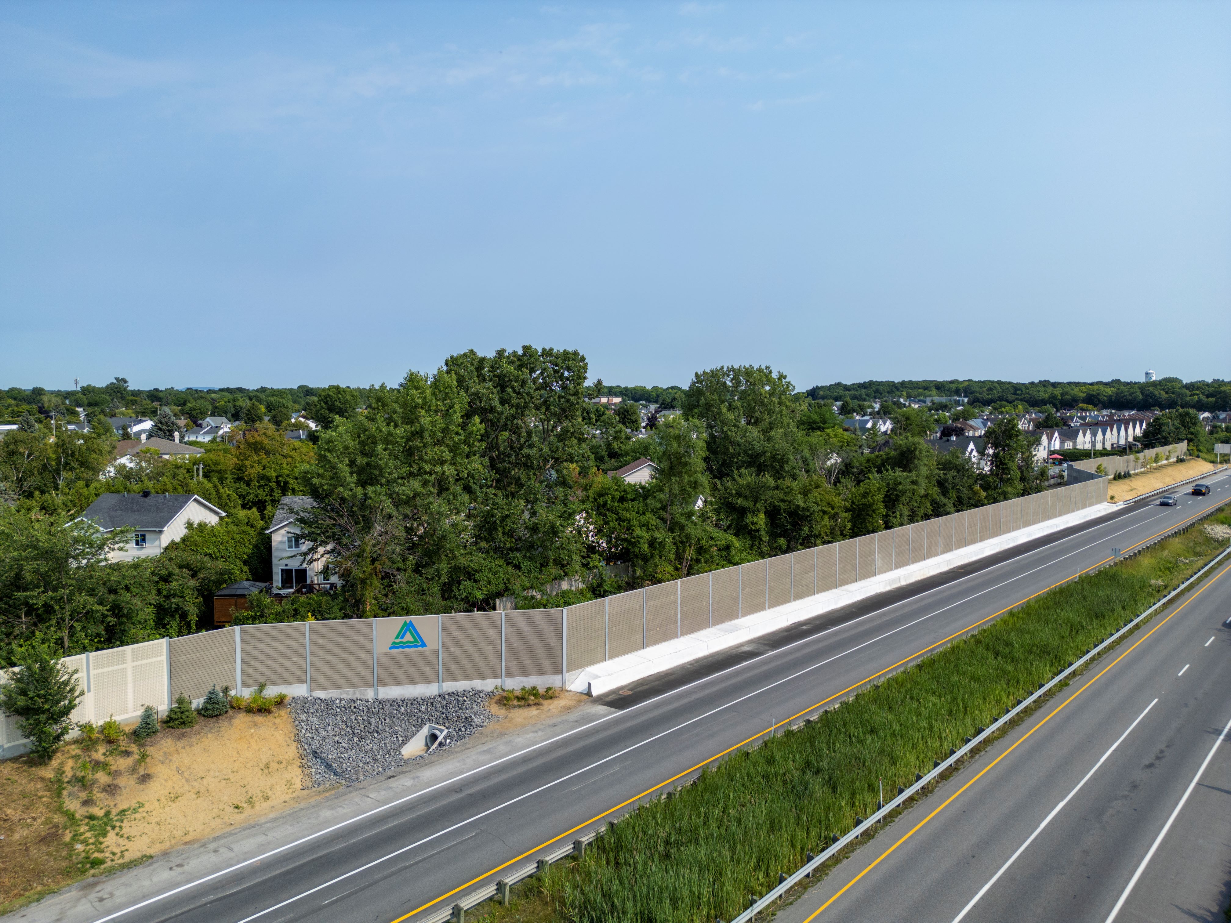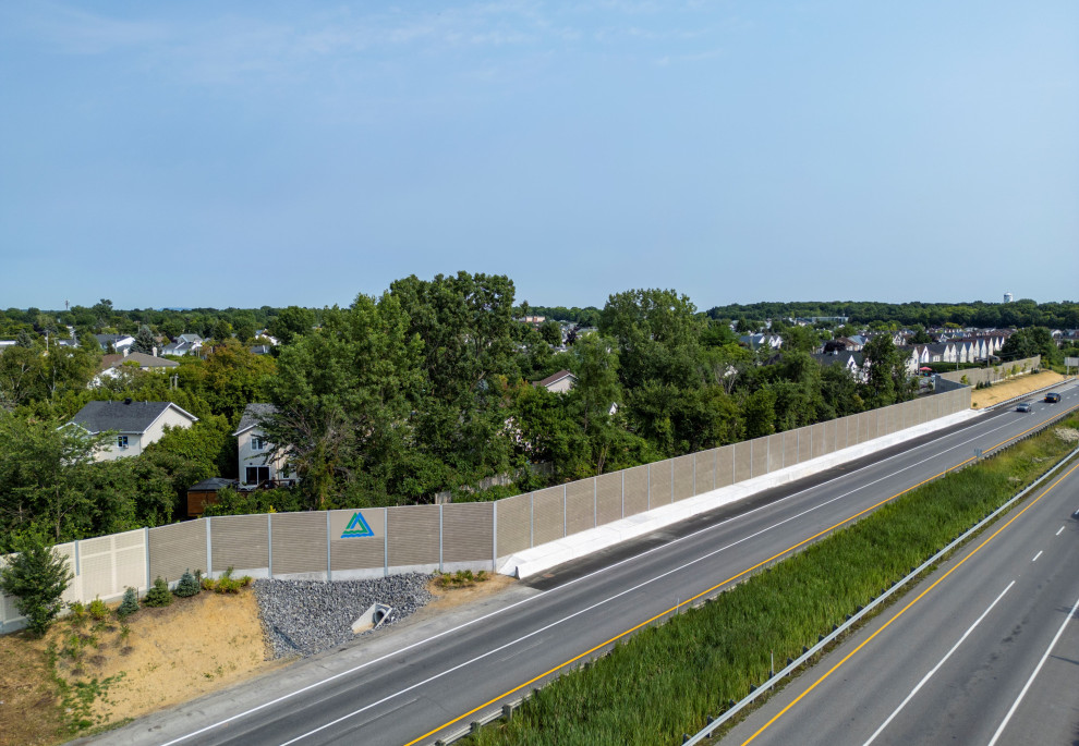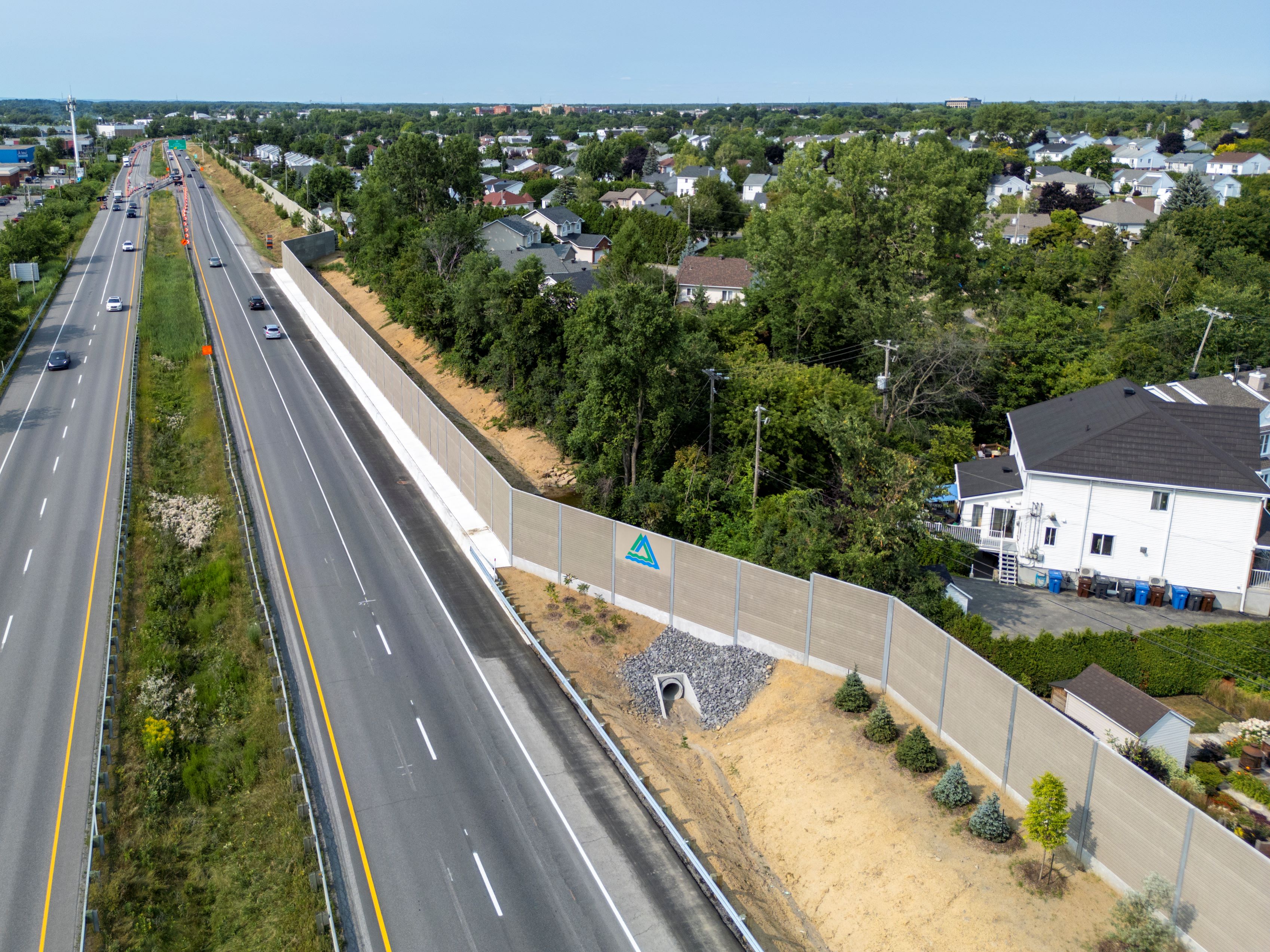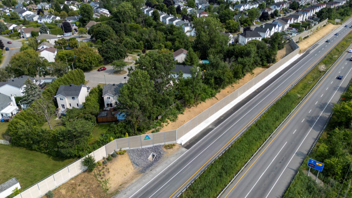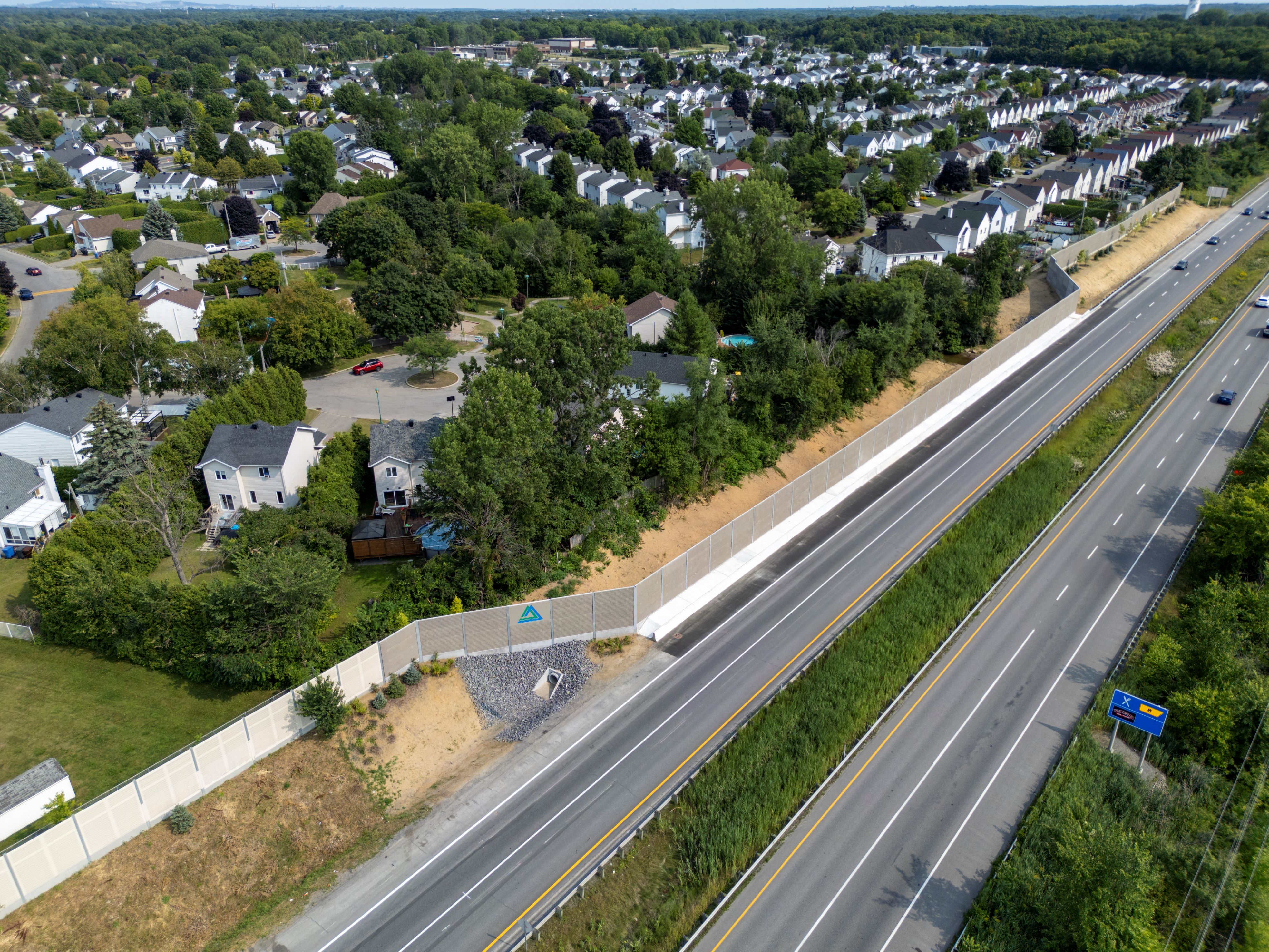La première phase, d’une longueur de 793 mètres, s’étend entre les rues Ronsard et Paul-Émile-Barbe. La seconde, maintenant terminée, ajoute 267 mètres supplémentaires entre le chemin de fer et le ruisseau Féré, pour une hauteur moyenne de 5 mètres. Au total, c’est plus d’un kilomètre de mur antibruit qui est érigé, représentant un investissement global de 10,7 M$, financé à parts égales par la Ville et le Ministère, conformément à la Politique sur le bruit routier.